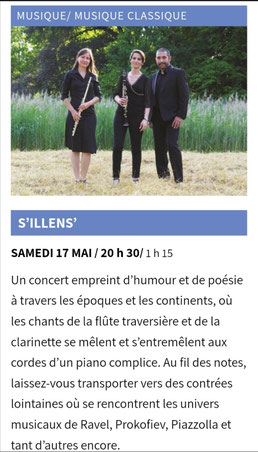 Entre musiques européennes et latino-américaines, l’ensemble S’illens’ vous invite à voyager au travers de pièces originales, arrangements et compositions. Un concert aux nuances multiples, tantôt délicates et intimes, tantôt audacieuses et lumineuses. Deux souffles (Olivia Abreu - flûte traversière et Angéline Véron - clarinette) se mêlent aux cordes d’un piano complice (Julio César Castillo) et « façonnent le S’illens’ » dans un répertoire éclectique, entre musique savante et populaire.